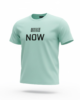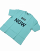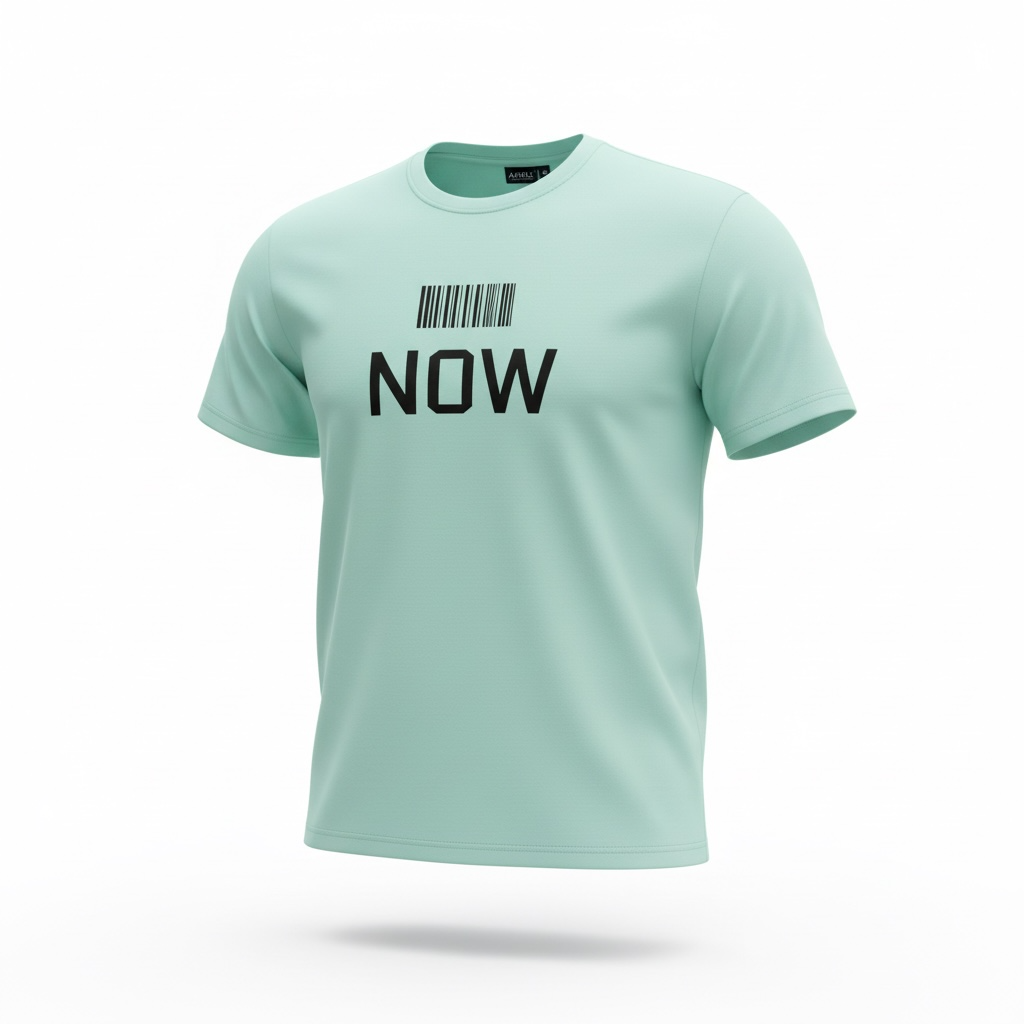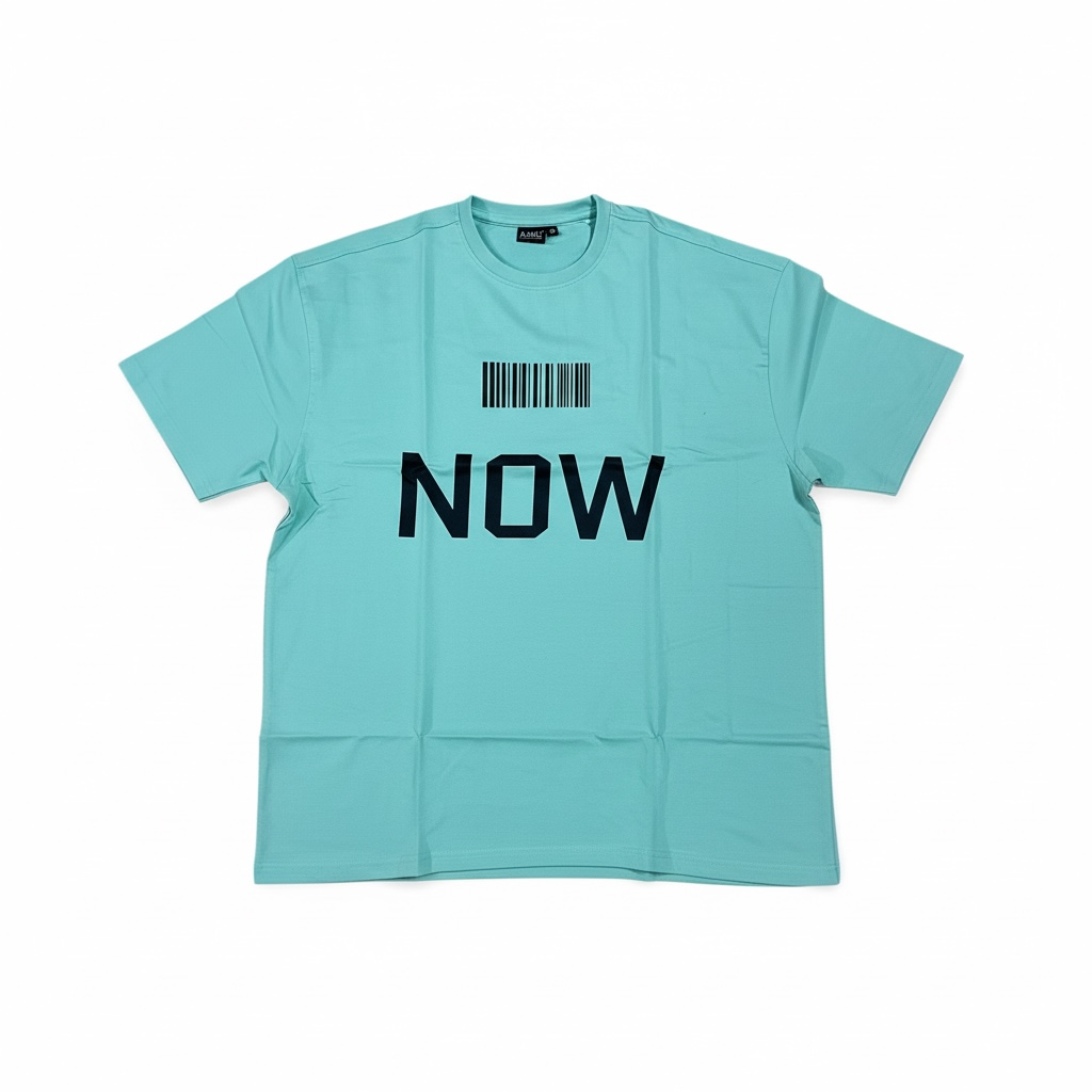 A mint-green oversized T-shirt with a bold barcode graphic and the word “NOW”. Minimal,