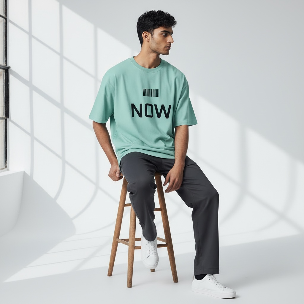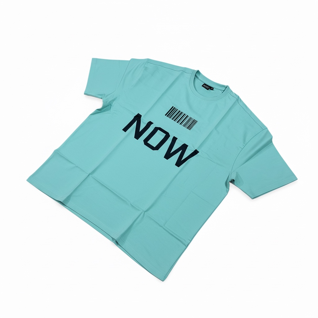 Make a bold statement with the NOW Barcode Oversized Tee, a modern essential for streetwear enthusiasts. This mint green oversized T-shirt features a striking barcode graphic paired with the powerful word “NOW”, symbolizing presence, urgency, and contemporary style.