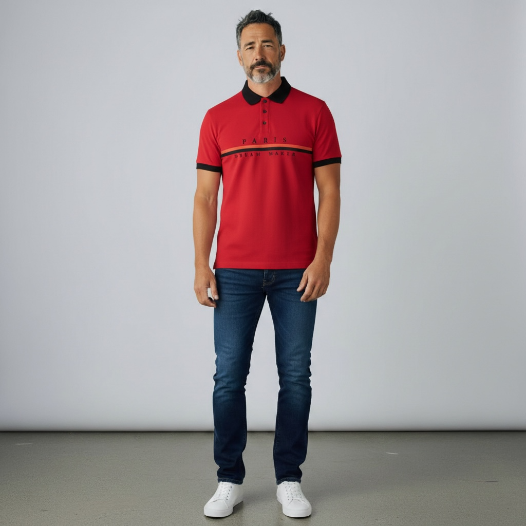 A red polo T-shirt with black collar and sleeve cuffs, featuring bold chest text “PARIS DREAM MAKER” accented by a black-and-yellow stripe. Smart, stylish, and perfect for casual or semi-formal wear.